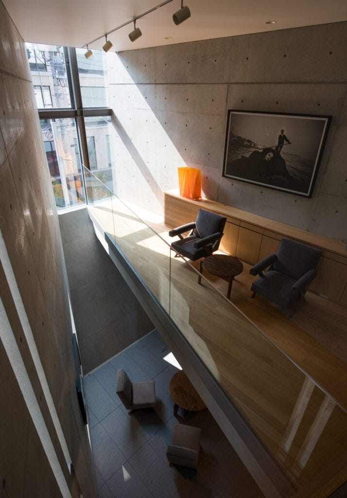 My favorite project in the book a penthouse in Manhattan (2013-19), situated in a 1913 building on the Upper East Side is the home of an anonymous art dealer. While it is not the typical project as it is a part of historical building, it captures everything I love about Ando’s work: a poetic harmony, where air and light come together. The interiors look like they are coming from the dream house of Steve Jobs, who for the majority of his life was famously in s quest for the perfect house. The sculptural stairway that leads up the roof terrace is a work of art that dominates the space. On the roof, the most spectacular green wall, designed by French botanist Patrick Blanc who is known as the innovator of the green wall and vertical hydroponics gardens. The combination of Ando’s colorless, minimalist interior, the rich green wall, and works of art by Hiroshi Sugimoto and Ellsworth Kelly is the perfect ensemble.