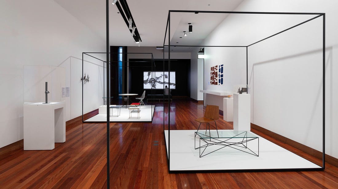 Here is a super important exhibition, which exemplified the fascination with 20th-century design. The interest in the design culture of the mid-century, developed in ‘other’ countries has recently occupied scholars, museums, and historians, seeking to uncover the counterparts of the US, France, Italy, and Scandinavia and to fill enormous gaps. The work and legacy of Clement Meadmore (1929-2005), the star of the Australian industrial design during the immediate years following WWII, is now the focus of a monographic survey exhibition at the Ian Potter Museum of Art, entitled ‘Clement Meadmore: The art of mid-century design.’ While Clement has been widely recognized and known for his welded sculptures, which he famously showed in Melbourne in the 50s, and in the US, after emigrating to New York in 1963, Meadmore’s early work as a designer living in Australia has not been known until now. What this show comes to reveal, is that Meadmore was not only one of a handful of designers who significantly raised standards in furniture design in post-war Australia, but also that his black steel frame furniture, upholstered in blind cord or canvas or combined with glass or plywood, was widely known and regularly featured in magazines during the fifties and won him honors and awards. The exhibition, the first survey of Meadmore’s design practice, and curated by Dean Keep and Jeromie Maver, consists of examples on loans from private collections and from Meadmore’s family. While the pieces belong to a typology and can be clearly recognized as mid-century furniture, they are original, chic, and well-designed, testifying to a great talent and a commitment to the zeigeist design principle. Photos by Christin Capurro.
