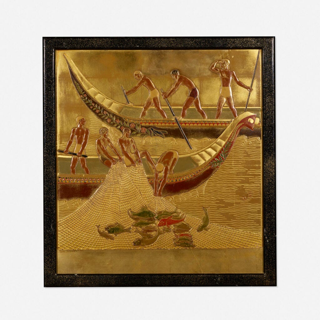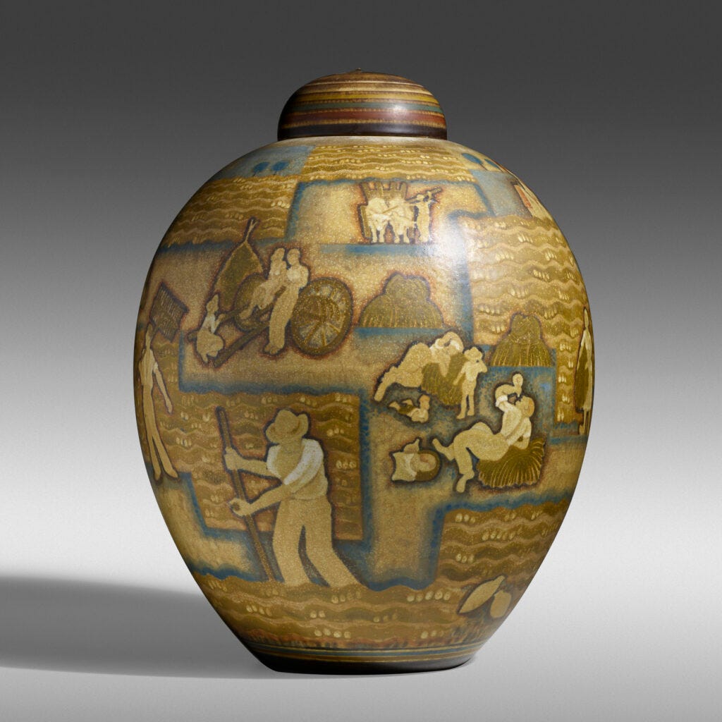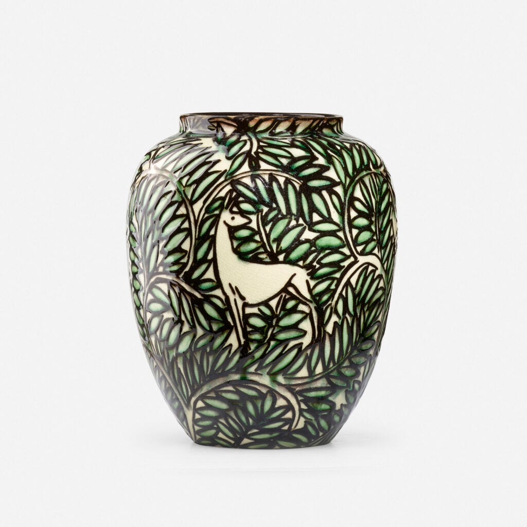 The story of Stein as a collector and his defined taste is told in this auction. Like many collectors who started to shape their passion for design in the 80s, he has a particular love for French Art Deco. Under the guidance of his long-time curator and adviser Rodney Richardson, Stein has acquired some of the finest examples of ceramics, glass, and furniture that appeared on the market. ‘Seymour always gave us excellent material,’ told me David Rago, the dynamic founder of the auction house, ‘but this is the best of all.’ The sale includes extraordinary examples of lacquer furniture and panels by Jean Dunand, rarely seen glass panels by Rene Lalique, and breathtaking historical ceramics. An amazing opportunity to score refined examples of 1930s design.