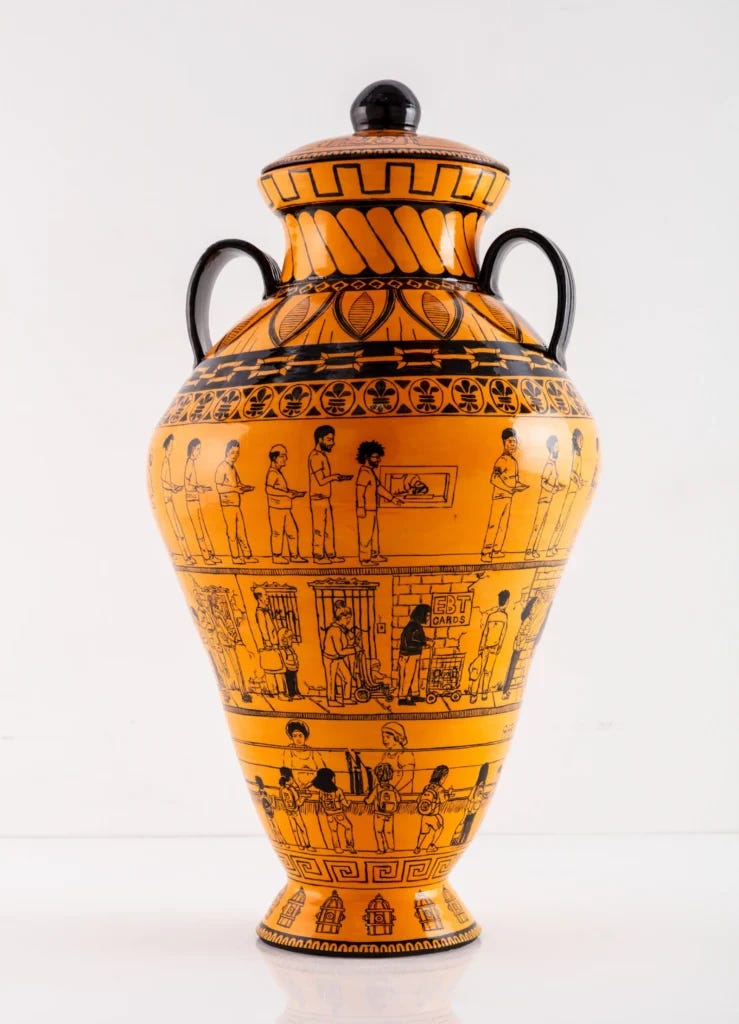 A strident voice for racial justice and inclusion for African American and Latino communities, Philadelphia-based potter and graffiti artist Roberto Lugo (b. 1981) is currently the darling of design curators. His recent solo exhibition Roberto Lugo: The Gilded Ghetto at R & Company in New York showcased a new and more personal direction in Lugo’s practice and inspired Delphia to acquire a piece called School to Prison Pipeline. In form and color, this enormous amphora references classical Greek pottery, but its iconography depicts Lugo’s experience of discrimination and hardship growing up, a child of Puerto Rican immigrants, in Philadelphia’s disinvested Kensington neighborhood. Since graduating from the Kansas City Art Institute, Lugo has been exploring the history of clay and its associations with white wealth, reworking its traditional forms to tell new, more diverse stories. Delphia said Lugo is “a contemporary maker who stands out in the field” and praised his unique approach to merging anthropological content—juxtaposing the language of European and American decorative arts with contemporary portraiture influenced by Hip Hop culture and social justice movements.