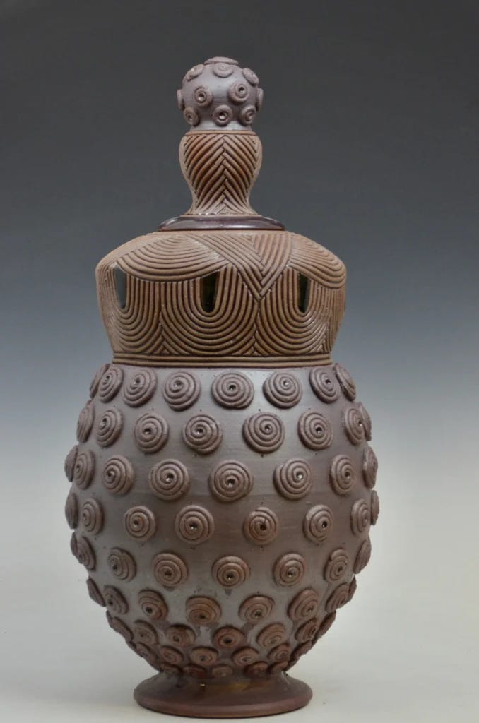 Delphia was visibly excited when she spoke about Syracuse-based ceramicist David MacDonald (b. 1945), who for four decades has created intricately patterned plates and vessels using coiled clay techniques. Dedicated to honoring his heritage and community, MacDonald draws on symbols and forms found in sub-Saharan pottery, textiles, and body decoration to develop his distinctive surface motifs. His pieces, Delphia explained, represent a generational voice that has reckoned with the anger and frustration of the Civil Rights Movement in the 1960s and 70s to embrace the beauty and richness of Black experiences and expressions.