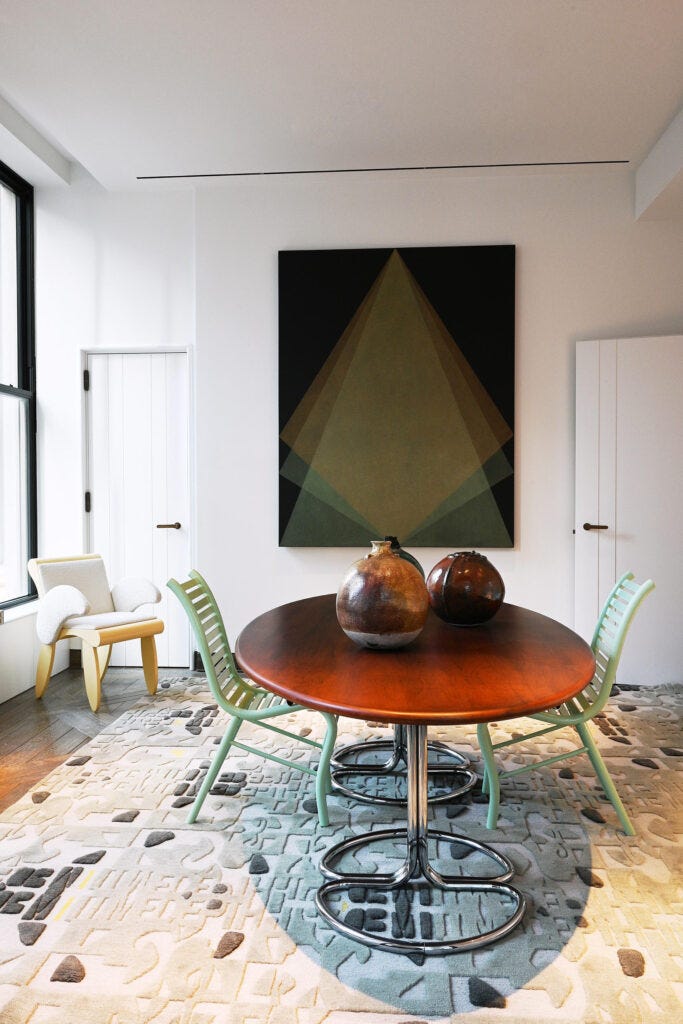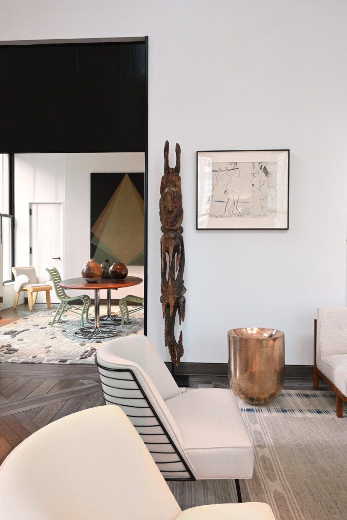The taste of Gabriel & Guillaume is well defined, consistent, and contemporary—modernist, interesting, crispy, exhibiting superb craftsmanship, replete with unusual forms, and devoid of ornamentation. The furniture and objects represent shining moments in design history, when daring forces came to construct design culture. Under their purview, conversations between objects of different eras and varied geographical locations are well established. This is the nature of the ‘curated’ interior, they explained, to form ensembles that are unique, personal, fresh. In the living room, looking wonderful together, are Joseph Hoffman’s iconic Sitzmaschine, created in 1905 in Vienna on one corner, and just opposite, Frank Gehry’s Little Beaver Chair and Ottoman in corrugated cardboard from the 1980s.