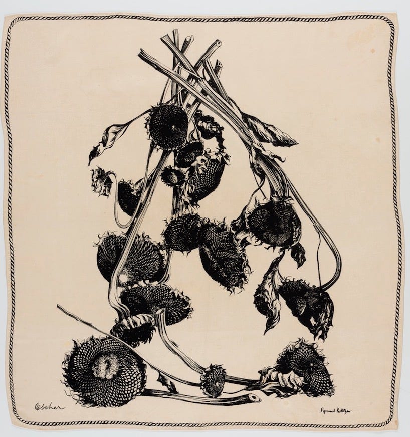 They emigrated to London, and in 1942 founded a textile company which first produced printed fabrics, and gradually other luxurious textiles for the fashion industry. The fabrics were crafted in the best workshops across Europe, particularly in Italy, and by the postwar years, the Aschers established their position as one of Britain’s best fabric makers. The famed flowered prints launched by Christian Dior in his New Look collection of 1947 came from their shop. The two invented an accessory that brought them global fame, when collaborating with world-renowned artists, including Henri Matisse, Henry Moore, André Derain, Cecil Beaton, and Alexander Calder to create patterns for scarves in silk crepe. They were called ‘Ascher Squares,’ and frequently appeared in fashion magazines. Each scarf was signed by the artist and identified by their recognizable styles. Calder created a scarf named La Mer with his typical organic structures; Pollitzer created his signature theme, Sunflower.