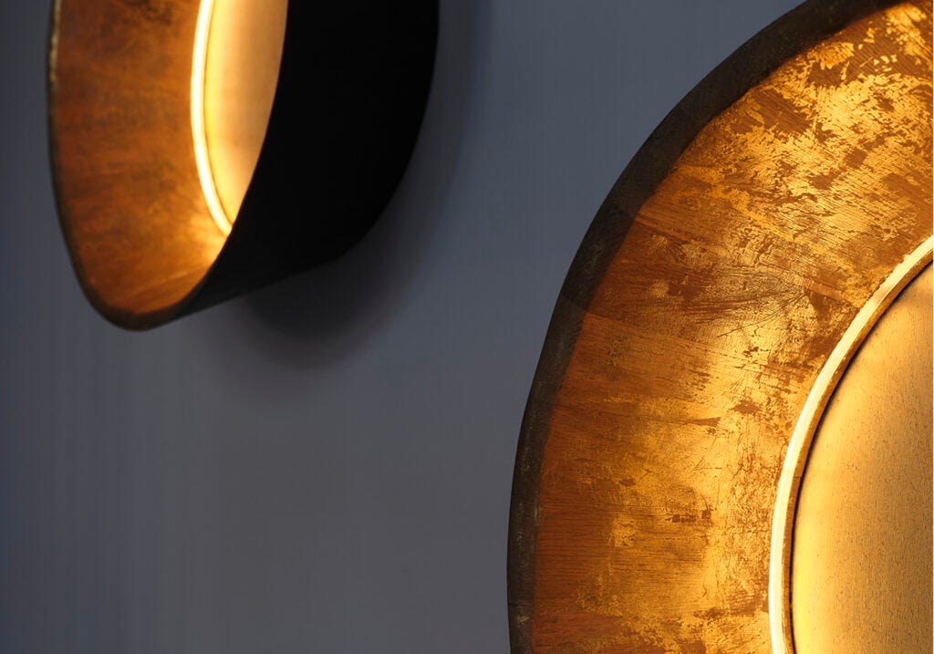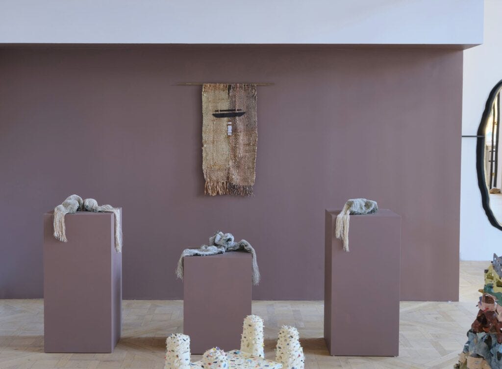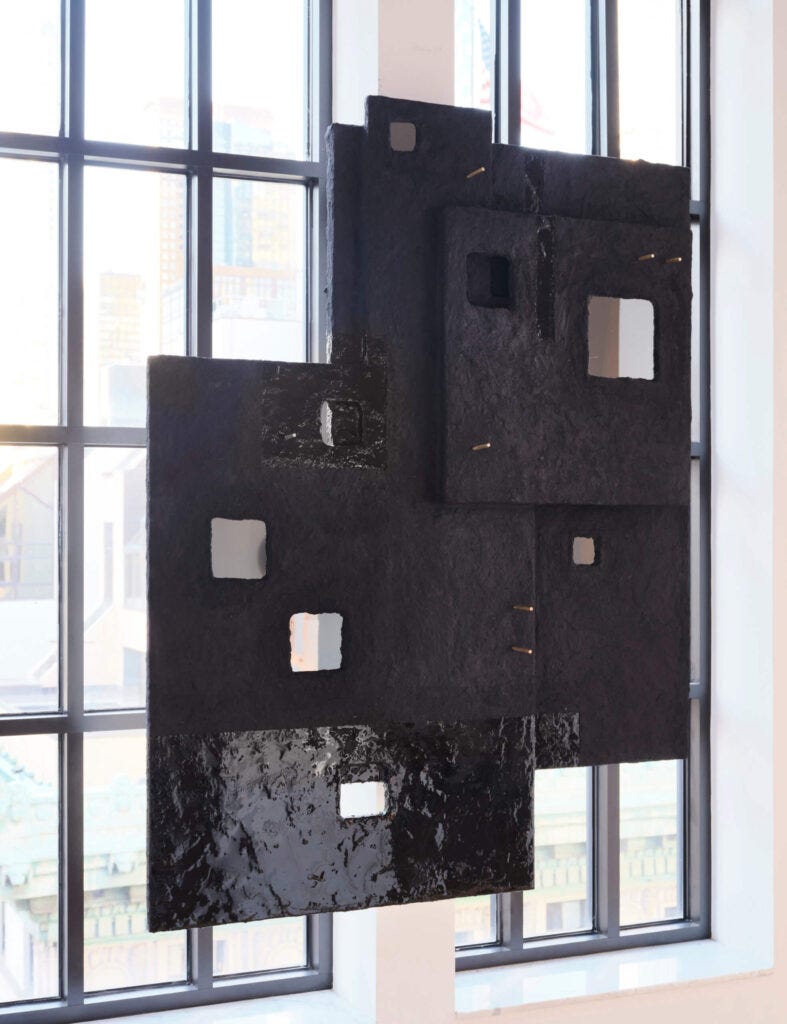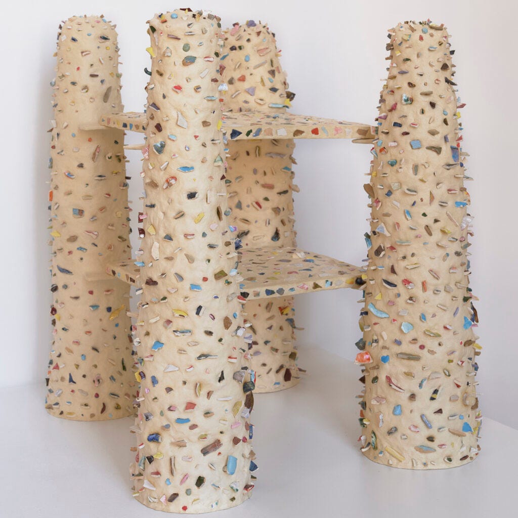 Tiarra Bell, newly graduated from RISD, is based in Philadelphia. The story she tells in her objects—lights and mirror crafted in wood—is an attempt to capture the divine nature of God according to her religious belief. The objects, she said, allow the viewers to reflect on themselves. Susannah Weaver, a graduate from Parsons School of Design, has invented a new material by mixing wool fibers with concrete. Working at the material lab at Parsons, she researched raw materials, their chemical processes and their life cycles. Maryam Turkey has created her pieces at an art residency at the World Trade Center. During the pandemic, the empty skyscrapers of lower Manhattan have come to provide the source of inspiration for the lamps and mirrors shaped in architectural silhouette, and crafted of clay mixed with paper and plaster. The abandoned skyscrapers and the daily interaction with them had come to echo her life story as a refugee from Iraq and the memory of buildings that had been destroyed in Baghdad during the War. As a group, the objects in this show embody the complexity that stands at the heart of contemporary design.
