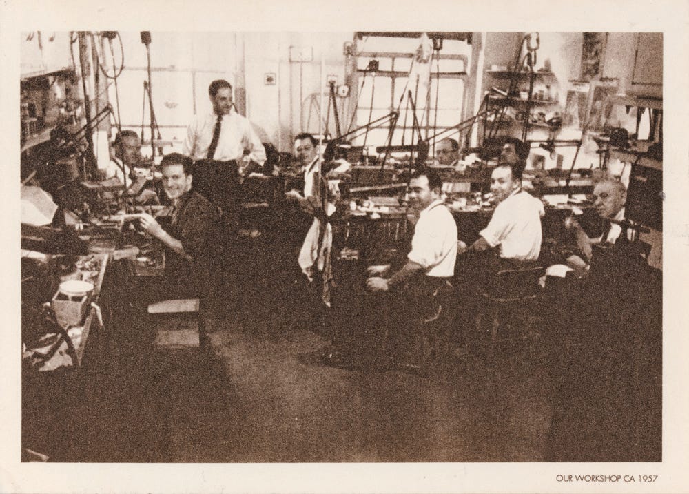The story of Carvin French is fascinating. It is the story of two Frenchmen, who built a distinctly American business in New York City. André Chervin was born in Paris in 1927 to a secular Jewish family with a history of working in the jewelry trade. The German invasion in the Second World War forced the family to flee for the south of France. After the war, Chervin enrolled at the Haute École de Joaillerie (est. 1867), the foremost jewelry school in France. While there, he trained in the required sequence of bench-work (filing, sawing, soldering, following design specifications), gold- and silversmithing, gem-cutting, and enameling. When Chervin emigrated to New York in 1951, he found that as a French-trained jeweler, he was in immediate demand and within several months was working for the esteemed jeweler, Louis Féron. While there, he met Serge Carponcy, a baguiste, or specialist in making rings, who became his partner in 1954 when the two opened Carvin French Jewelers with the combined funds of $2000.