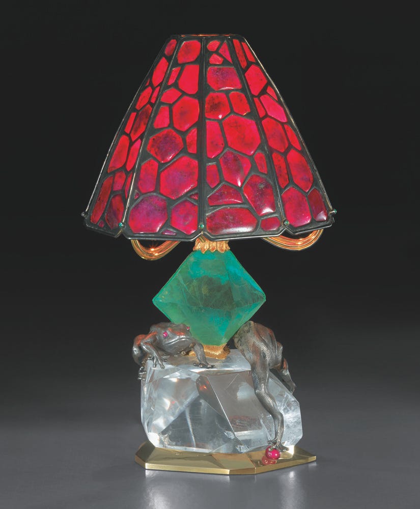 The exhibition, which presents handful jewelry and mostly objets d’art, comes to expose the work of André Chervin and his artistry and not what he has done for other jewelry houses. The work is exquisite — lamps, clocks, figurines, boxes, personal accessories – made in gold with rubies, diamonds, and sapphires, jadeite jade, lapis lazuli, amethyst, and rock crystal quartz. These tiny masterpieces reminding me of the precious miniature crafted for Europe’s royal houses during the 17th and 18th centuries. ‘This collection represents a lifetime of work, André Chervin illuminates, ‘with these objets d’art, I was able to choose myself what to make, and when, and exactly how I wanted them. I was free from the constraints that naturally come when you are manufacturing for a customer’s order. These are my own expressions. These are my art, pure and simple. These are my true freedom.’