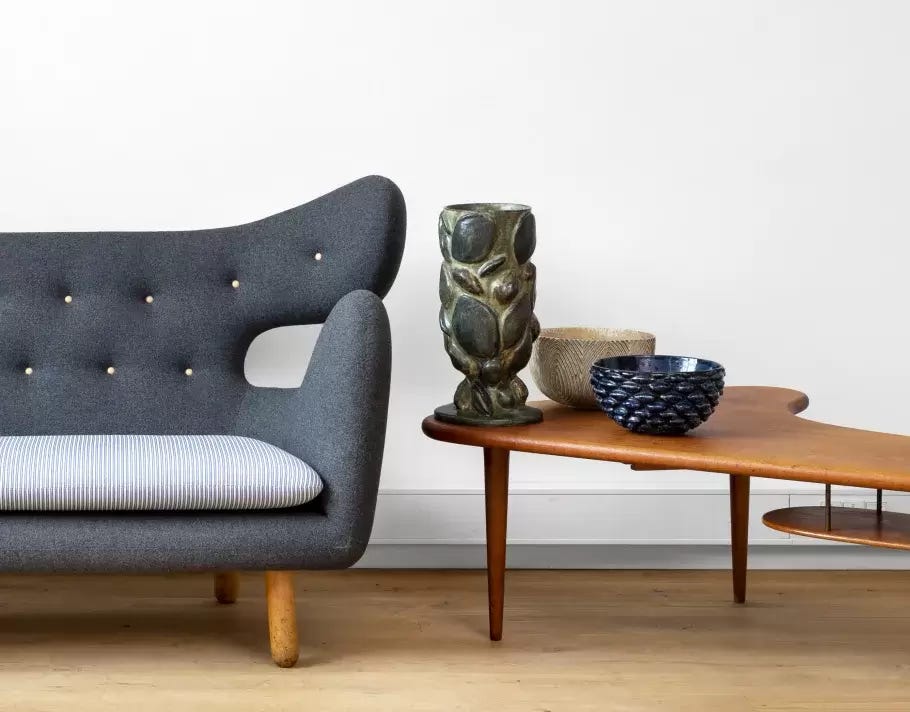 It all started in 1939, when Juhl had just dropped out of school from the Royal Danish Academy of Fine Arts’ School of Architecture, and went to work for architect Vilhelm Lauritzen on the construction of the Radio House in Copenhagen. It was long before the trained architect created some of the most iconic pieces in the history of Danish Modern, and before he came to fame. In his spare time, young Juhl designed furniture for private customers, and this was one of these cases. He was asked by cabinetmaker Niels Vodder to design furniture for his booth at the Cabinetmakers’ Guild’s Exhibition, and for that show, he created this set, which Vodder fabricated. With its organic form that look more like sculptures by Jean Arp than pieces of furniture, and the look was sensational and provocative in its day.
