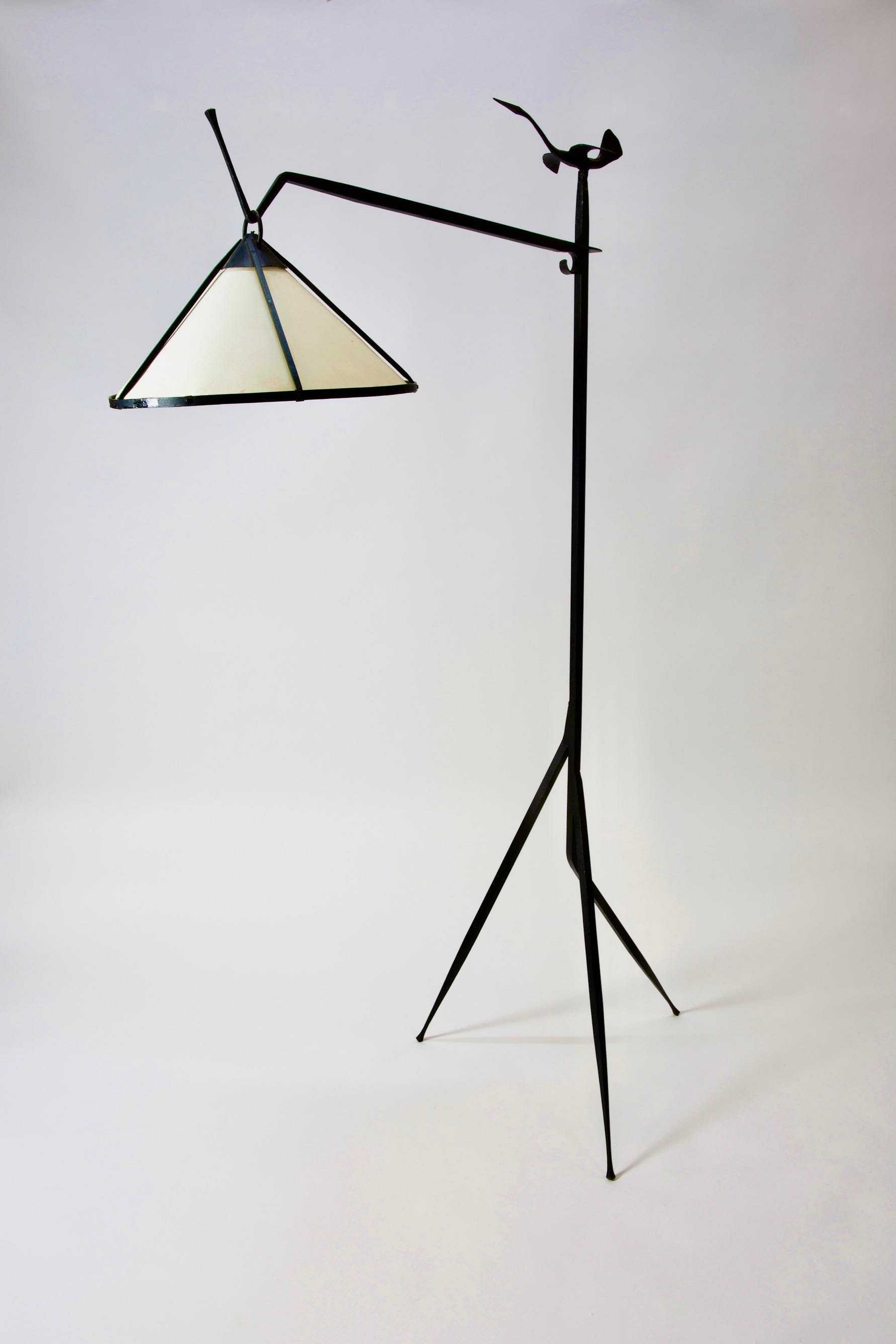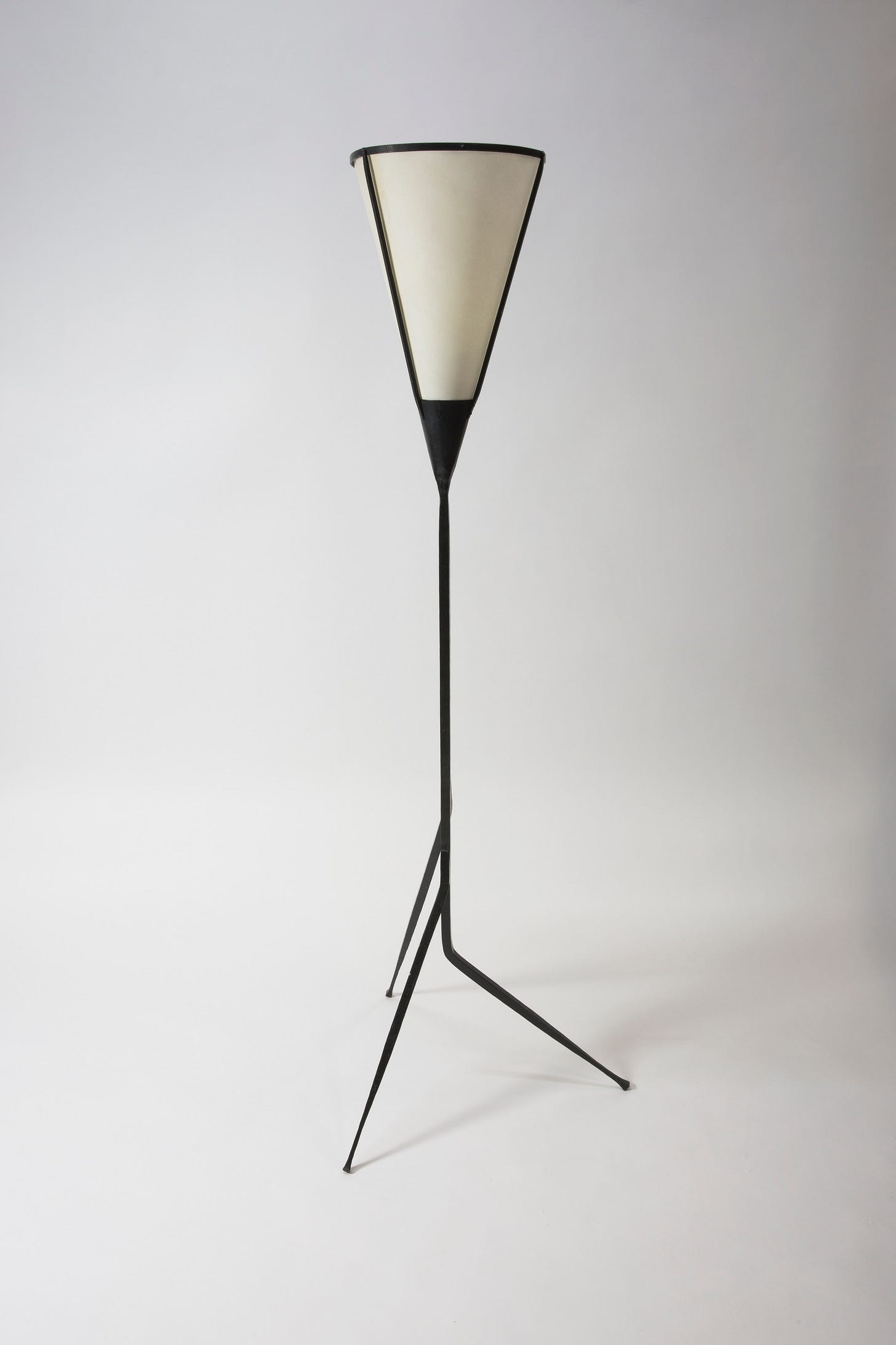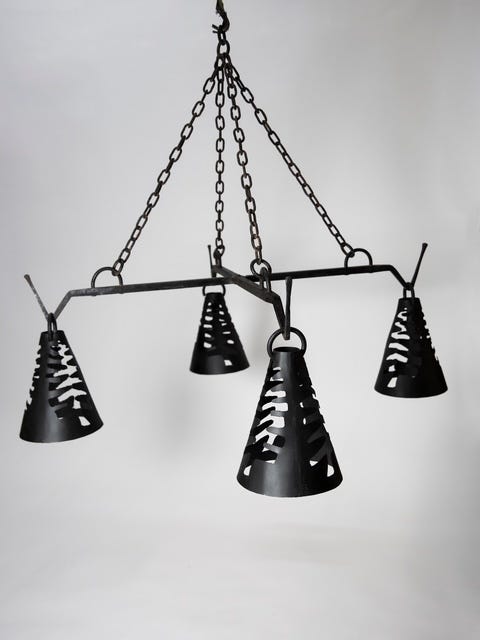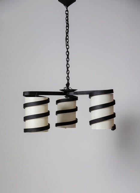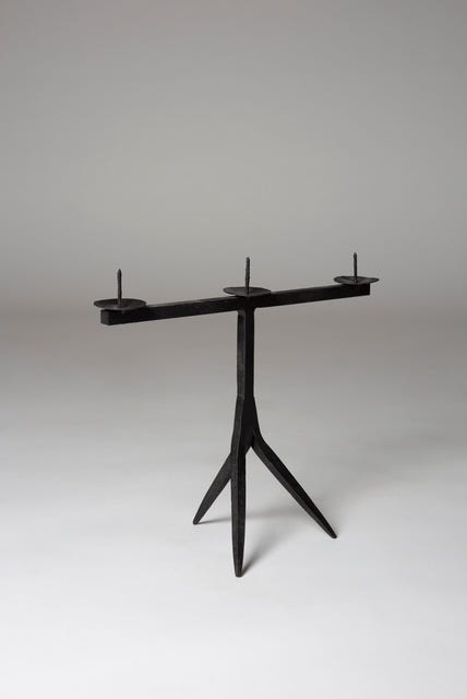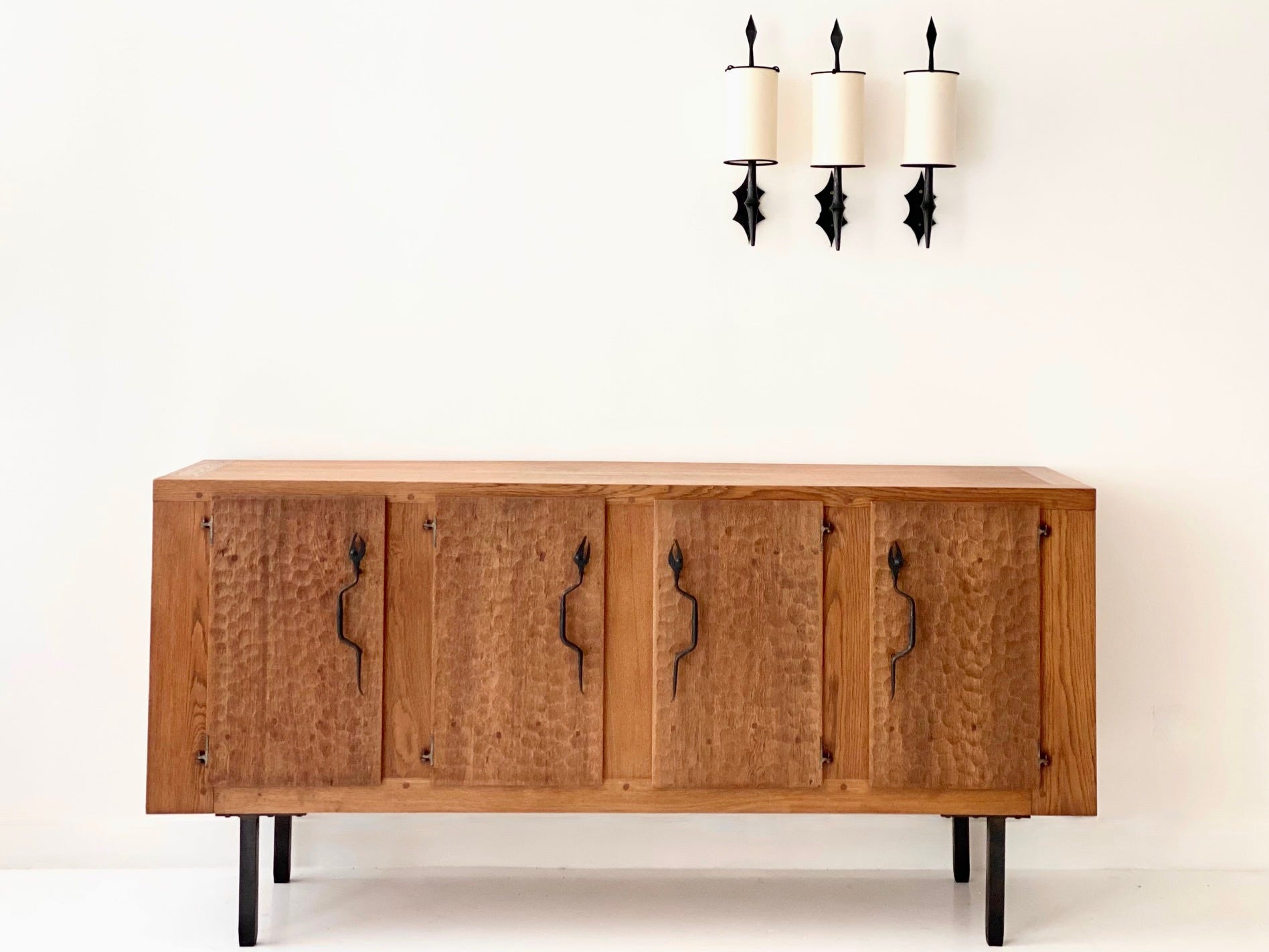 While his pieces have a distinctive French look, they grew from a very different vision and philosophy than the furniture designed by his French contemporaries, Perriand, Prouvé, and Jeanneret. Whereas the more famed figures in French postwar design were socialists who sought to utilize modernist design to elevate the lives of the millions through the use of new materials and machine production, developing industrial design for duplication, Touret focused on the most traditional, almost primitive crafts – wood carving, blacksmithing, basketry – creating artisanal furniture, lighting, and objects. He sought to have the artist’s hands visible, to use local materials, and to provide a source of income for local craftspeople. He was passionate about preserving the crafts, creating furniture in his own voice, free of influence of the modern movement which was developing in Paris. He formed Les Atelier de Marolles, a cooperative of craftspeople who brought his designs to life. The furniture is functional, in modernist, minimal forms, with strong marks of the craftsman’s hand that lend the pieces an expressive quality. Paradoxically, his pieces are simple yet complex. They use sustainable materials—primarily wood and iron—and are humanistic, original, and artistic.