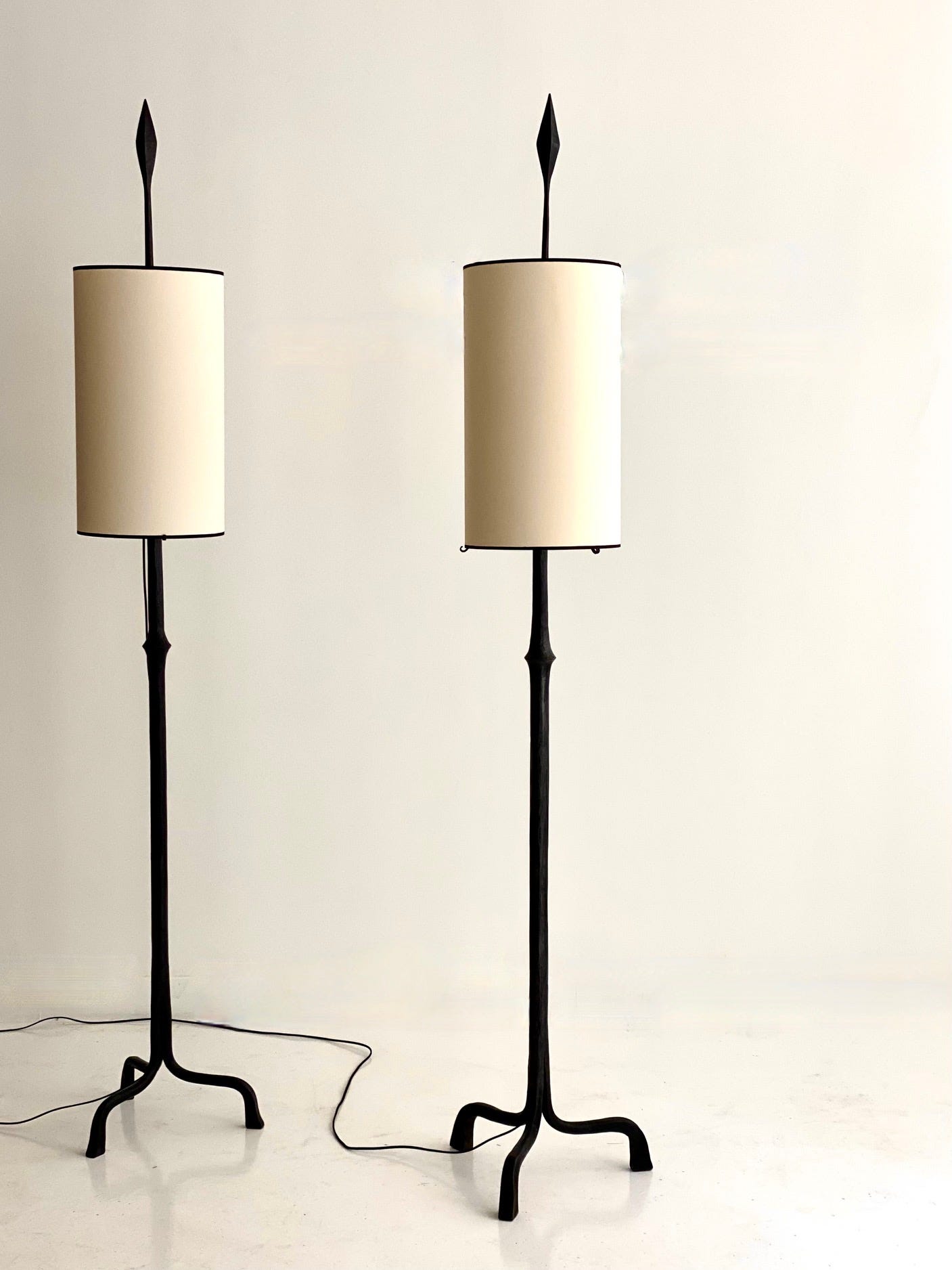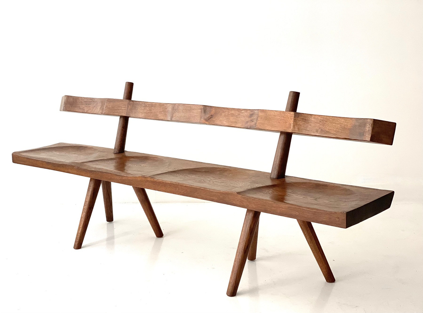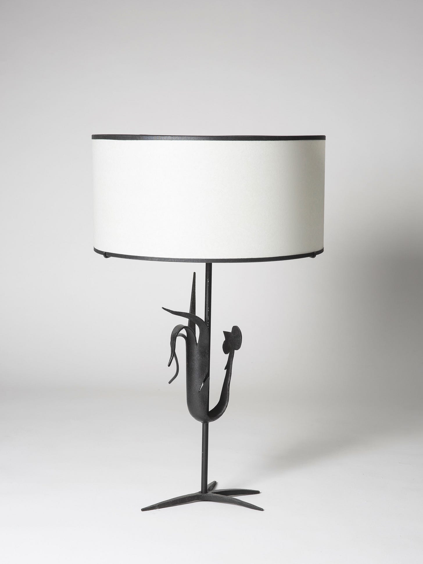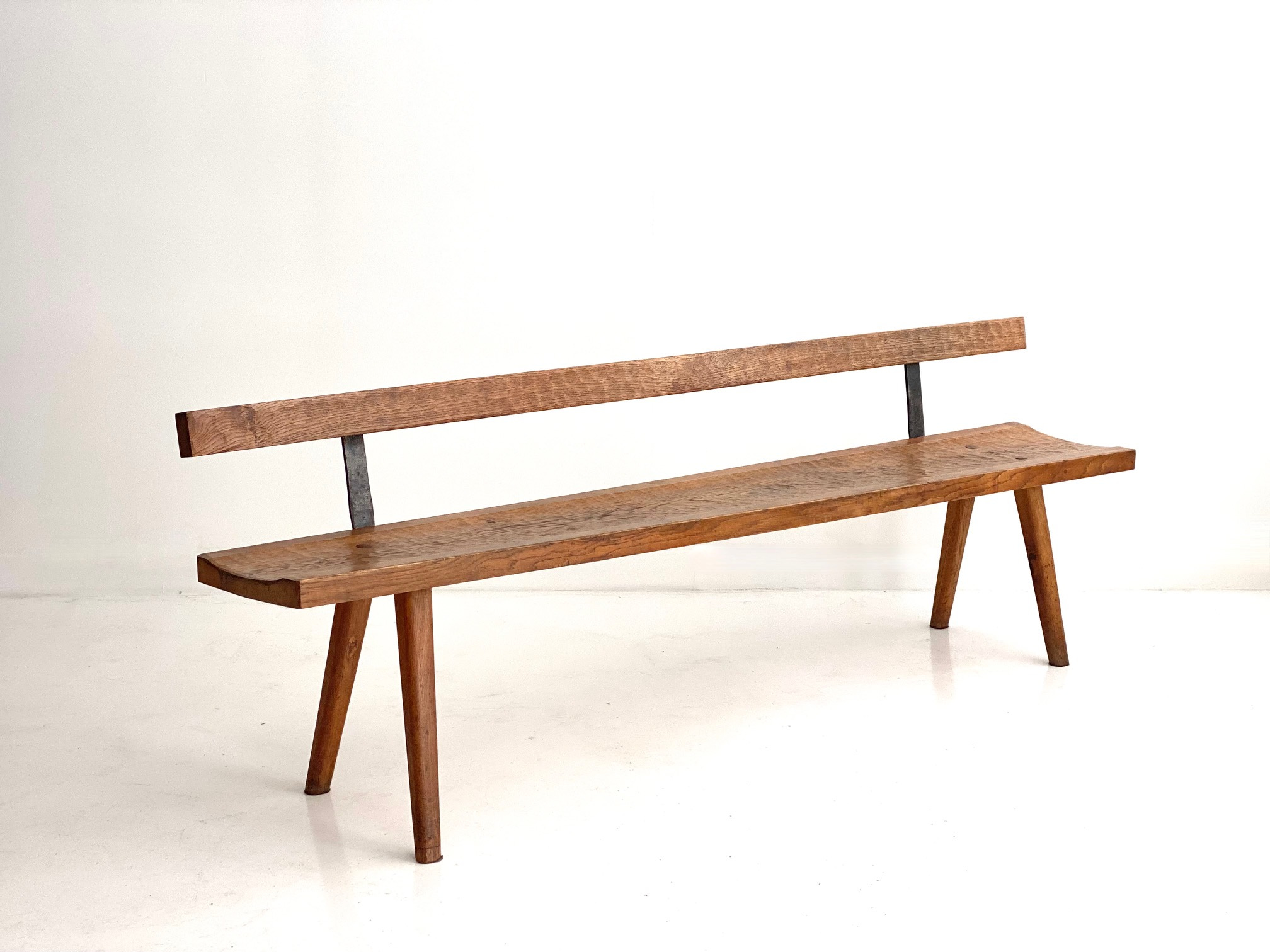 While his pieces have a distinctive French look, they grew from a very different vision and philosophy than the furniture designed by his French contemporaries, Perriand, Prouvé, and Jeanneret. Whereas the more famed figures in French postwar design were socialists who sought to utilize modernist design to elevate the lives of the millions through the use of new materials and machine production, developing industrial design for duplication, Touret focused on the most traditional, almost primitive crafts – wood carving, blacksmithing, basketry – creating artisanal furniture, lighting, and objects. He sought to have the artist’s hands visible, to use local materials, and to provide a source of income for local craftspeople. He was passionate about preserving the crafts, creating furniture in his own voice, free of influence of the modern movement which was developing in Paris. He formed Les Atelier de Marolles, a cooperative of craftspeople who brought his designs to life. The furniture is functional, in modernist, minimal forms, with strong marks of the craftsman’s hand that lend the pieces an expressive quality. Paradoxically, his pieces are simple yet complex. They use sustainable materials—primarily wood and iron—and are humanistic, original, and artistic.