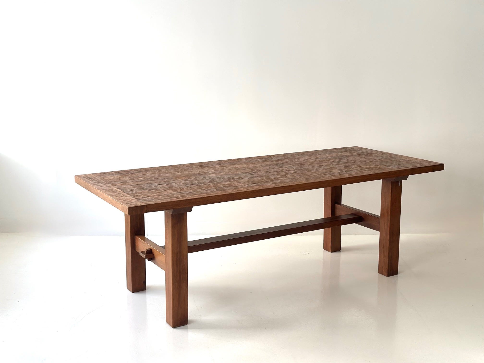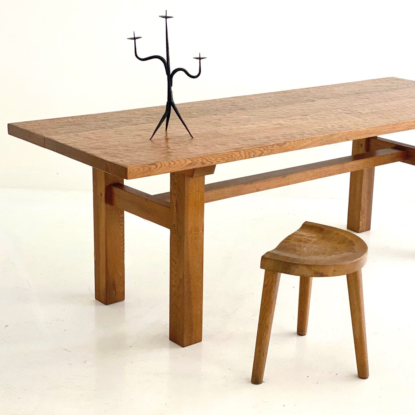 In a local tobacco shop in Marolles, Touret met local craftspeople – carpenters, blacksmiths, basket makers, ceramicists – who crafted furnishings but had no sense of design, inspiring him to establish the Ateliers of Marolles. Isolated in the shop, he developed his own modern vocabulary, designing furniture, lamps, and other accessories in wood and iron, crafted by the local artisans, in addition to creating abstract sculptures in tree trunks, and reclaiming wooden beams and sheet metal. The furniture pieces were modern and artistic, sold directly from the shop to clients, but more substantially at an annual showcase in the nearby town of Blois, and on a regular basis at the Parisian department store Primavera Le Printemps, curated by its artistic director Colette Guéden. This was where Parisian clients discovered Touret’s furniture. Only 8-10 craftspeople were employed at the atelier, and according to Desprez, who met with descendants of the makers, the production was limited to 10-15 dining sets a year. Each piece was carved individually, each one unique, crafted of local red oak.