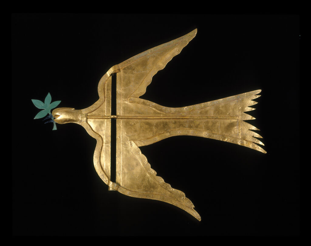 Above: Curlew, artist unidentified, Seaville, N.J., c. 1874. Gold leaf on sheet metal with iron straps. 46 1/8 x 92 1/4 x 3/8 in. (American Folk Art Museum. Gift of Alice Kaplan, trustee (1977–1989), 2001.3.2. Photograph by John Bigelow Taylor).