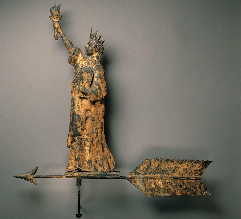 Are you familiar with weathervanes? They are instruments used to show the directions of the wind, placed as finials on the highest points of buildings, particularly churches, barns, civic buildings, and shops. They take the form of sculptures and decorative objects, crafted in wood or metal. While weathervanes were invented in ancient China and Greece, they have come to be synonymous with Americana. They are still produced and used today, but their popularity went out of vogue in the 1950s. As soon as their usage waned, they attracted the attention of collectors and have since become a form of collectible art, found not only in historical museums, but also at the homes of collectors across the country. The American Folk Art Museum in New York has opened a remarkable show devoted to weathervanes made from the 17th century to the middle of the 20th century.