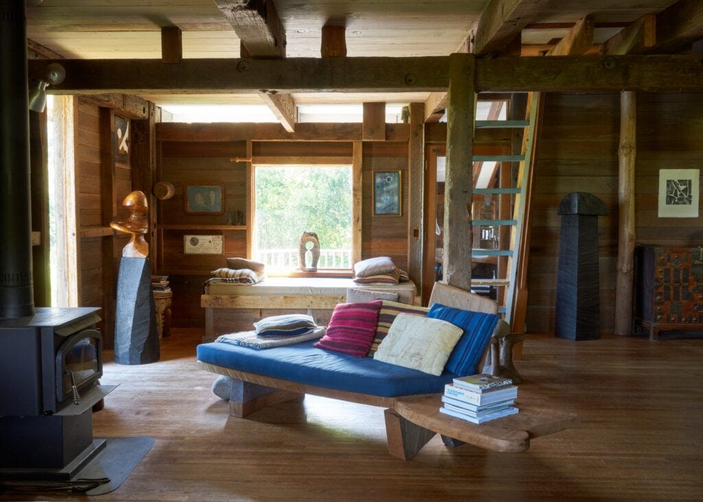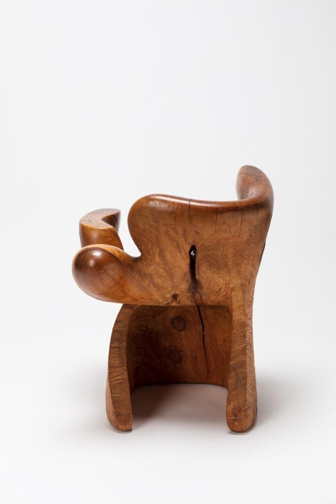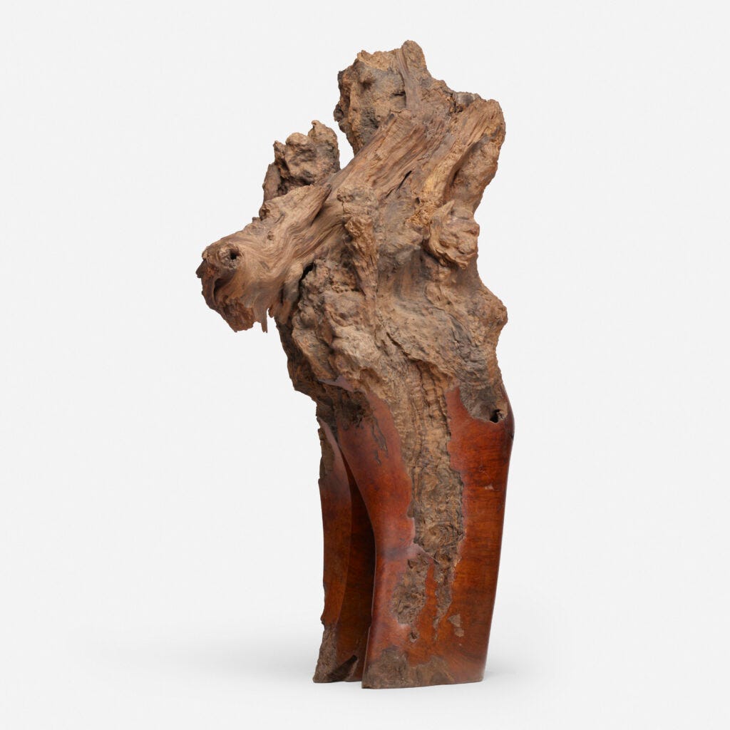 Like Takaezu, Blunk also chose to live and work in the backcountry, settling on a hillside in Northern California, where he and his first wife built their home by hand. Later lauded as his magnum opus, Blunk’s house sparked his exploration of materials beyond clay. He came to treat the chainsaw as his main creative instrument, creating large-scale sculptures from timber salvaged from logging sites and along the shoreline. He also carved and polished stones found in local rivers and along the Pacific coast and continued to practice ceramics alongside painting and jewelry. Committed to living lightly on the land, Blunk described his hand-made home as “one big sculpture,” the central focus of a life dedicated to making—and making do.