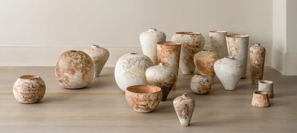 Ishihara’s kiln is a sprawling, wood-fired ‘nobori-gama’ (or ‘climbing kiln’) that he built by hand and which he fuels with locally sourced pine he chops himself. Unlike most potters who ultimately wood-fire their pieces, Ishihara does not use an electric or gas kiln. He relies solely on the nobori-gama—a kiln whose roots in Japan stretch back to the 17th century—for every stage of firing. His initial bisque firing stage spans 40 days, as Ishihara fires each piece up to three times. I am eager to visit his studio so that I may view this process firsthand and document this special live-art integrated creativity. Stay tuned. The exhibition is open through April 20th.